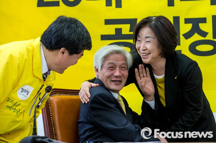 (서울=포커스뉴스) 심상정 정의당 상임대표가 24일 오전 서울 영등포구 국회에서 열린 '20대 국회의원총선거 공천장 수여식'에 참석해 김세균(가운데) 정의당 공동대표 및 후보들과 인사를 나누고 있다.