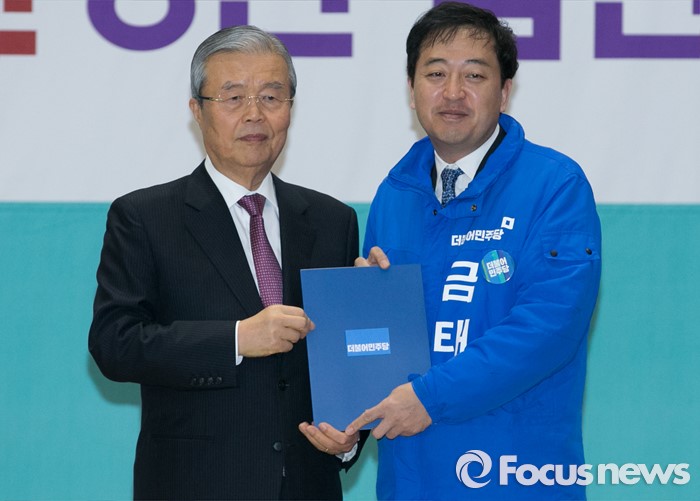 (서울=포커스뉴스) 김종인(왼쪽) 더불어민주당 비대위 대표가 24일 오전 서울 여의도 국회에서 공천장 수여식에 참석해 금태섭 서울 강서갑 후보에게 공천장을 전달한 뒤 기념촬영을 하고 있다.