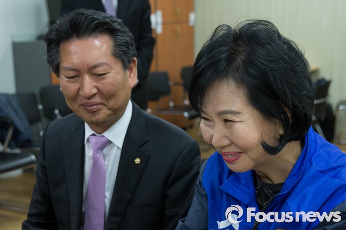 (서울=포커스뉴스) 20대 총선 후보자 등록이 시작된 24일 오전 서울 마포구 선관위에서 손혜원(오른쪽) 더불어민주당 후보가 등록 서류를 제출하고 있다.