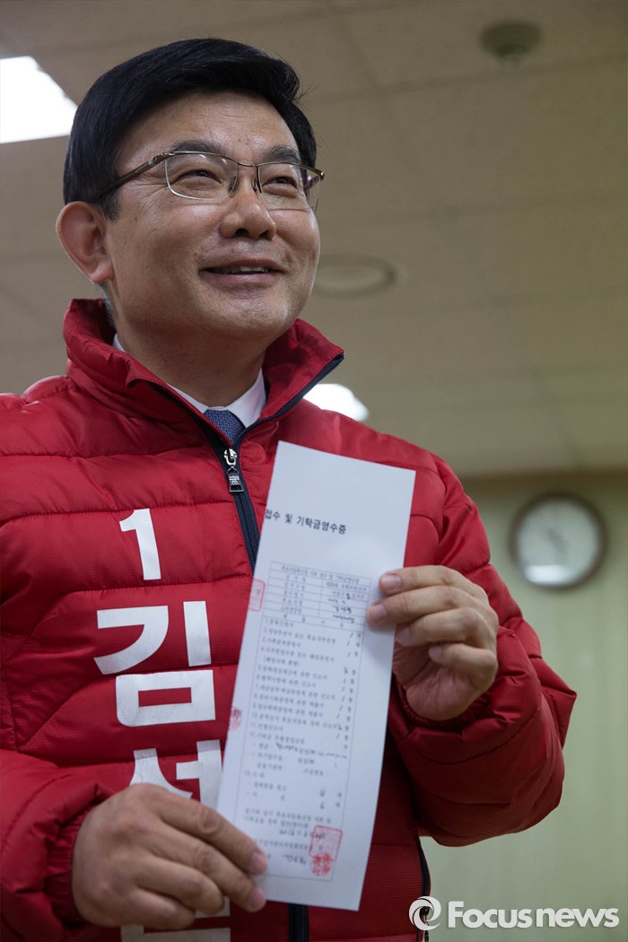 (서울=포커스뉴스) 20대 총선 후보자 등록이 시작된 24일 오전 서울 마포구 선관위에서 김성동 새누리당 후보가 등록을 마친 후 기탁금 영수증을 들고 미소짓고 있다.