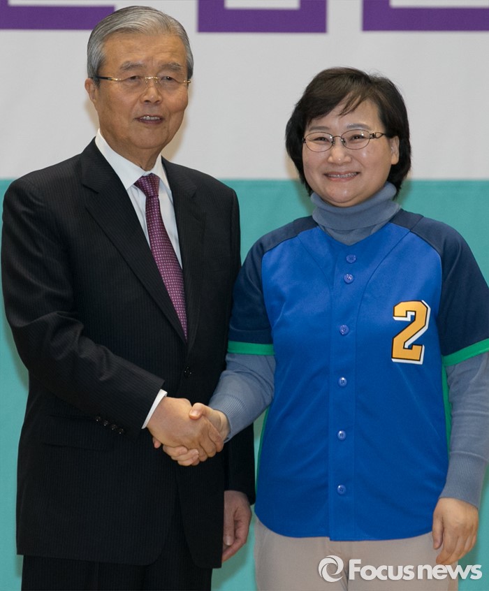(서울=포커스뉴스) 김종인(왼쪽) 더불어민주당 비대위 대표가 24일 오전 서울 여의도 국회에서 공천장 수여식에 참석해 문미옥 비례대표 후보와 기념촬영을 하고 있다.