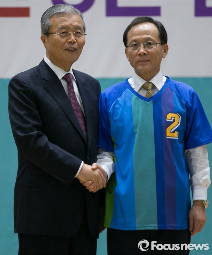(서울=포커스뉴스) 김종인(왼쪽) 더불어민주당 비대위 대표가 24일 오전 서울 여의도 국회에서 공천장 수여식에 참석해 이수혁 비례대표 후보와 기념촬영을 하고 있다.