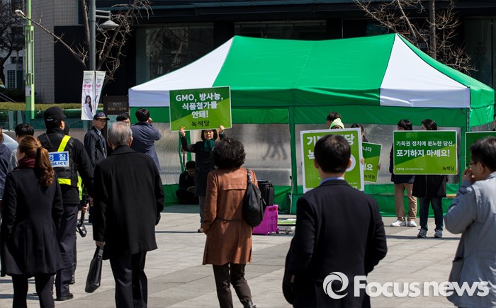 (서울=포커스뉴스) 24일 오전 서울 광화문광장에 설치된 천막 선거사무소 앞에서 녹색당원들이 선거 참여를 독려하는손 팻말을 들고 있다.