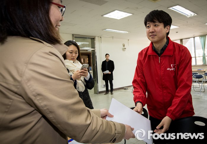 (서울=포커스뉴스) 4·13 총선 후보자 등록 첫 날인 24일 오후 서울 노원구선거관리위원회를 찾은 이준석 새누리당 노원병 후보가 선관위 관계자에게 후보등록서류를 건네고 있다.