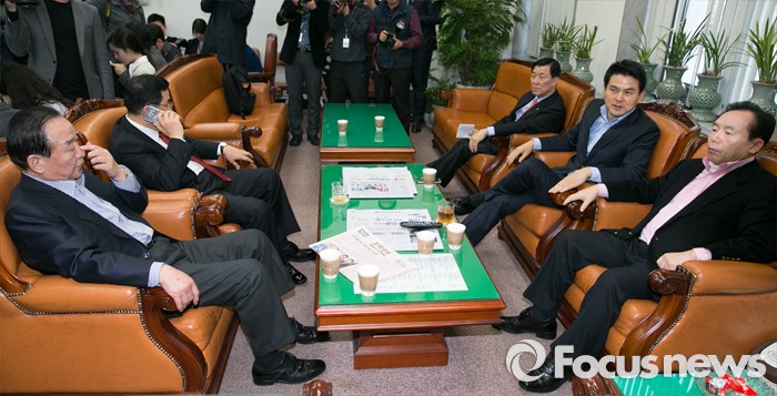 (서울=포커스뉴스) 24일 오후 서울 여의도 국회 새누리당 원내대표실에서 긴급 소집된 최고위원회 간담회를 마친 뒤, 최고위원들이 자리에 앉아 있다. 앞줄 왼쪽 시계방향으로 서청원 최고위원, 김정훈 정책위의장, 황진하 사무총장, 김태호, 이인제 최고위원.