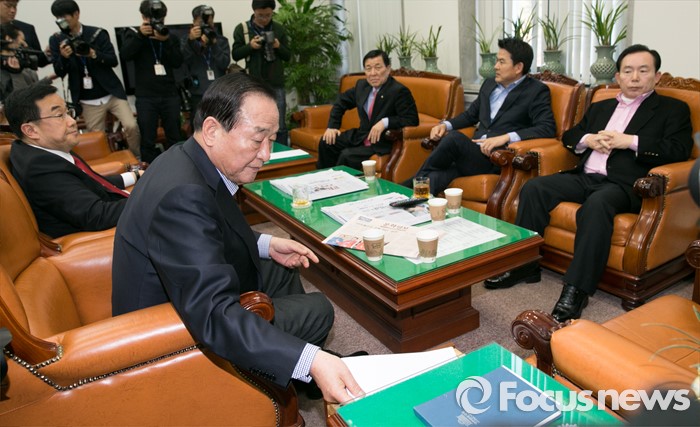(서울=포커스뉴스) 서청원(앞줄 왼쪽) 새누리당 최고위원이 24일 오후 서울 여의도 국회 새누리당 원내대표실에서 긴급 소집된 최고위원회 간담회를 마친 뒤, 문서를 서랍에 넣고 있다. 앞줄 왼쪽 시계방향으로 서 최고위원, 김정훈 정책위의장, 황진하 사무총장, 김태호, 이인제 최고위원.