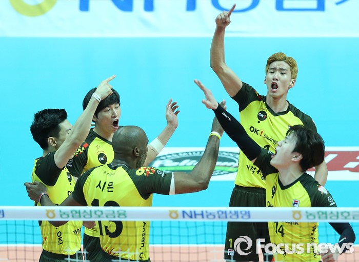 (안산=포커스뉴스) 24일 안산상록수체육관에서 열린 2015-2016 V-리그 남자부 챔피언결정전 4차전 OK저축은행-현대캐피탈 경기에서 OK저축은행 시몬이 블로킹 득점을 올리고 동료들과 환호하고 있다.
