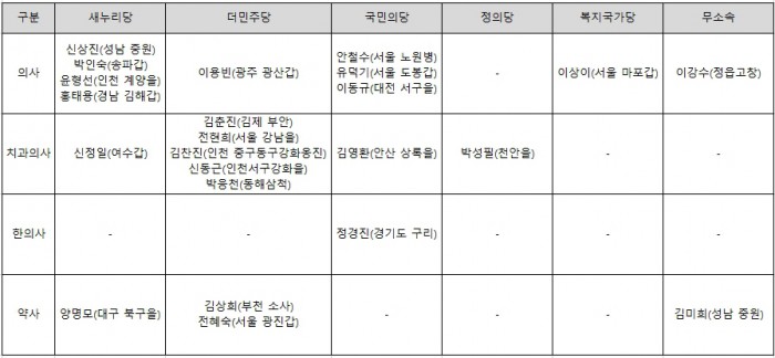 더불어 민주당은 의사 1명, 치과의사 5명, 약사 2명 등으로 치과의사 출신이 많았다.