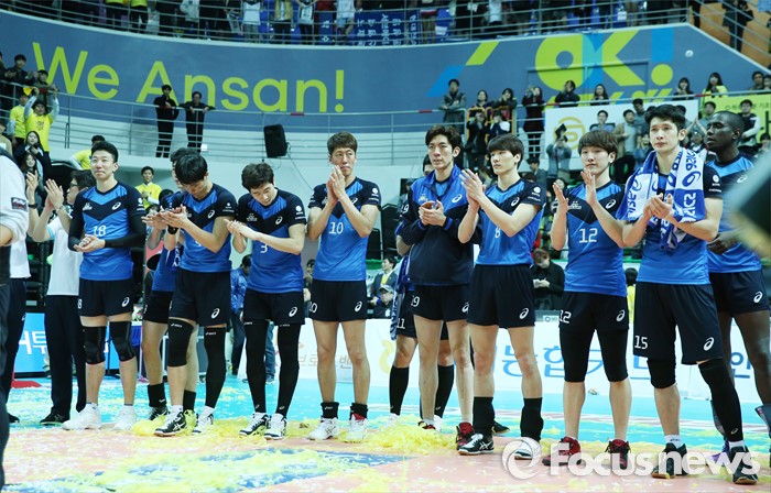 (안산=포커스뉴스) 24일 안산상록수체육관에서 열린 2015-2016 V-리그 남자부 챔피언결정전에서 준우승한 현대캐피탈 선수들이 침울한 표정으로 박수 치고 있다.
