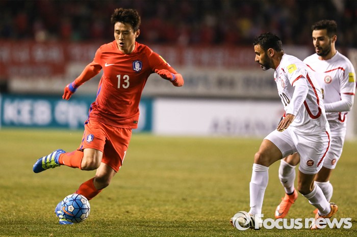 (안산=포커스뉴스) 24일 오후 경기도 안산 와스타디움에서 열린 2018 러시아 월드컵 아시아 2차 예선 7차전 대한민국 대 레바논 경기에서 구자철 선수가 드리블을 하고 있다.