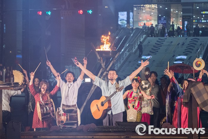 (서울=포커스뉴스) 24일 오후 서울 왕십릭역 광장 특설무대에 설치된 텐트극장에서 한·일 연극 공동 프로젝트 일환으로 열린 '백년, 바람의 동료들' 연극에서 일본극단 신주쿠양산박 단원들이 멋진 무대를 선보이고 있다.