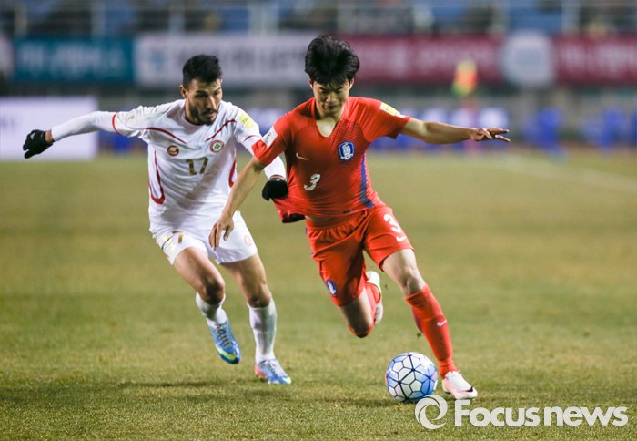 (안산=포커스뉴스) 24일 오후 경기도 안산 와스타디움에서 열린 2018 러시아 월드컵 아시아 2차 예선 7차전 대한민국 대 레바논 경기에서 장현수 선수(20번)와 이청용 선수(17번)가 수비를 하고 있다.