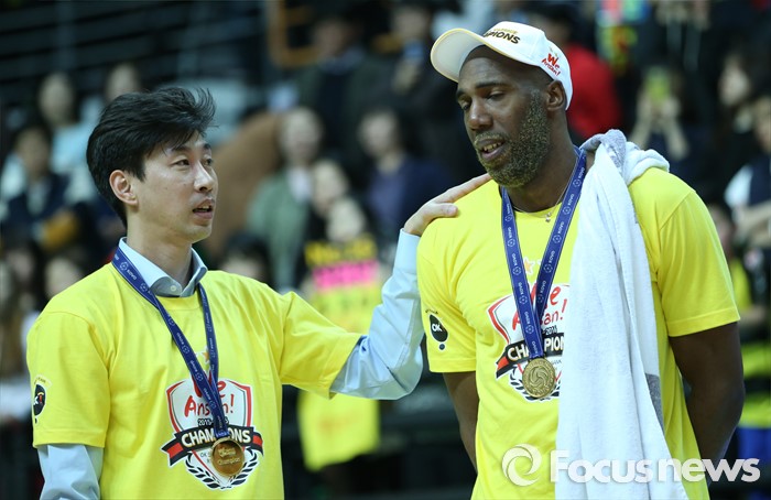 (안산=포커스뉴스) 24일 안산상록수체육관에서 열린 2015-2016 V-리그 남자부 챔피언결정전 4차전에서 OK저축은행이 현대캐피탈을 물리치고 3승1패로 2연패를 달성했다. 경기를 끝내면서 선수들이 환호하고 있다.