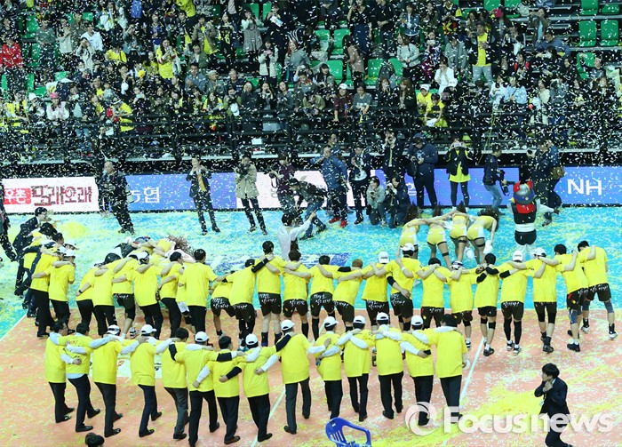 (안산=포커스뉴스) 24일 안산상록수체육관에서 열린 2015-2016 V-리그 남자부 챔피언결정전에서 현대캐피탈을 물리치고 3승1패로 2연패를 달성한 OK저축은행 선수들이 팬들을 향해 어깨동무를 하고 세리모니를 하고 있다.