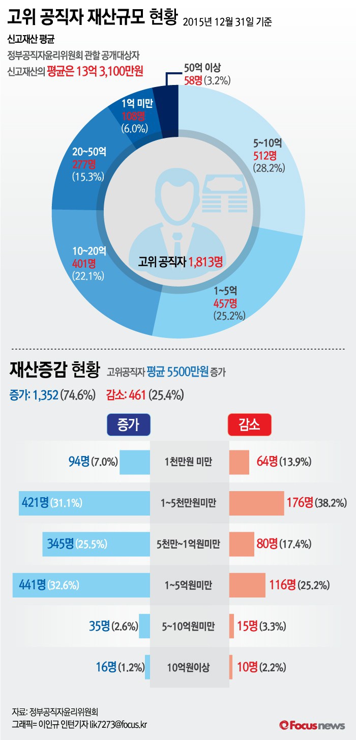공개대상자 1,813명의 재산은 종전 신고액 대비 평균 5,500만원 증가하였다.