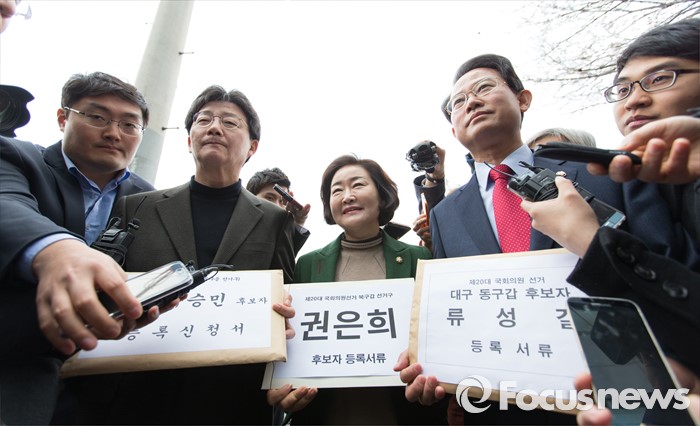 (대구=포커스뉴스) 25일 오전 대구 동구선거관리위원회에서 유승민(왼쪽부터, 대구 동을), 권은희(대구 북갑), 류성걸(대구 동갑) 의원이 후보자 등록에 앞서 기념촬영을 하고 있다.