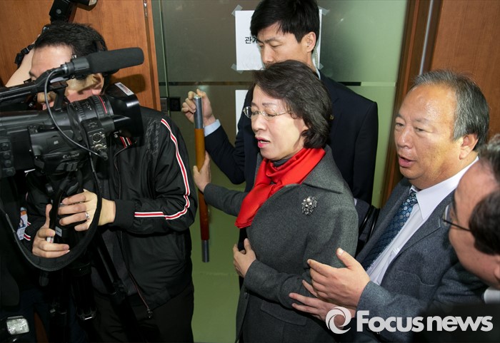 (서울=포커스뉴스) 김무성 새누리당 대표가 당 공천관리위원회의 결정에 반발해 유승민 의원 등 지역구 6곳에 대해 무공천을 선언해 갈등이 이어지고 있는 25일 오전 서울 여의도 당사 김 대표실 앞에서 이인선 대구 수성을 예비후보가 대화를 요청하고 있다.