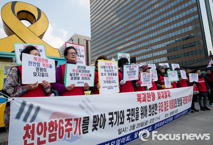 (서울=포커스뉴스) 25일 오전 서울 광화문광장에서 열린 천안함 6주기 추모 및 북한 규탄 기자회견에 참석한 엄마부대봉사단 회원들이 천안함 희생 장병들을 기리는 손팻말을 들고 있다.