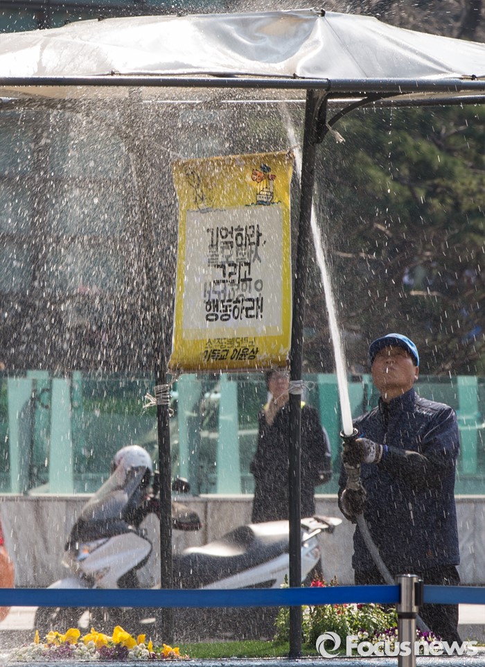(서울=포커스뉴스) 25일 오전 서울 광화문광장에서 공원관리 직원들이 화단을 청소하고 있다.