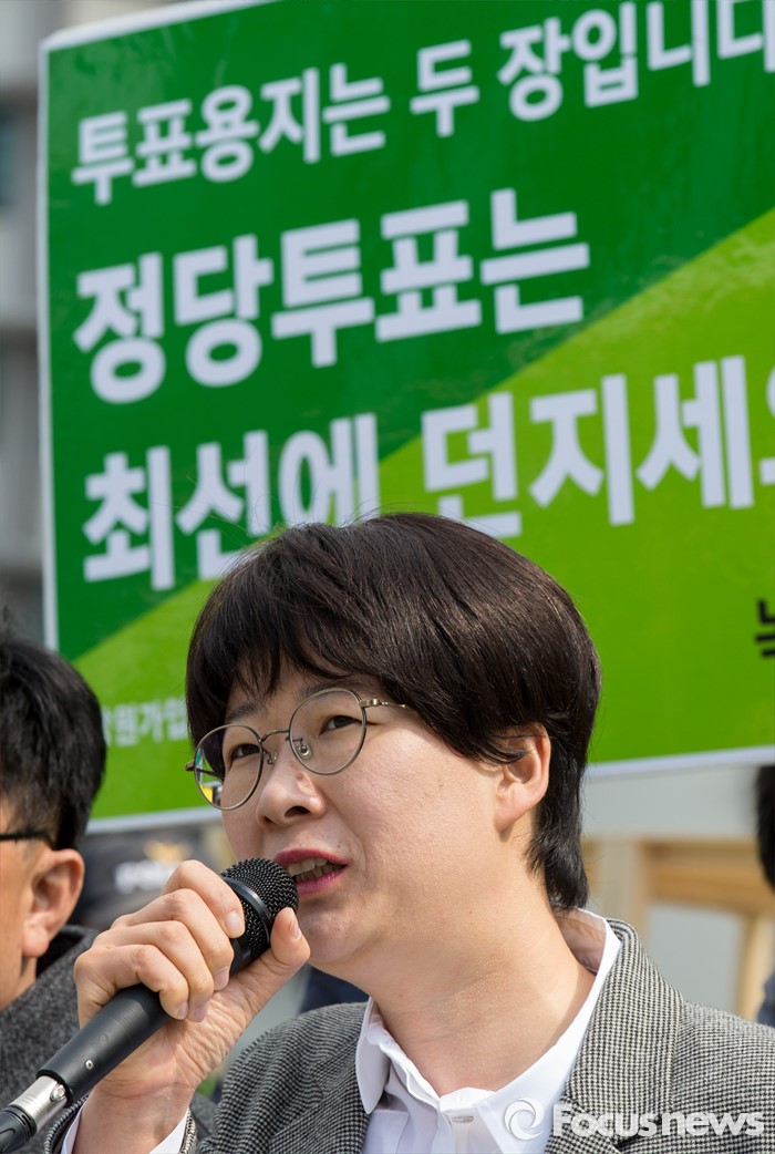 (서울=포커스뉴스) 25일 오전 서울 광화문광장에 마련된 녹색당 천막 선거사무소 앞에서 열린 선거제도 전면 개혁 요구 기자회견에 참석한 이유진 공동운영위원장이 기존 선거제도의 문제점에 대해 설명하고 있다.