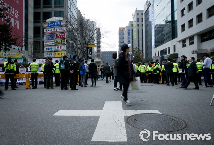 (서울=포커스뉴스) 김무성 새누리당 대표가 당 공천관리위원회의 결정에 반발해 유승민 의원 등 지역구 6곳에 대해 무공천을 선언해 갈등이 이어지고 있는 25일 오후 서울 여의도 당사 앞에서 김 대표의 결정에 반대하는 시민단체와 김 대표 지지자들이 각각 집회를 하고 있다.
