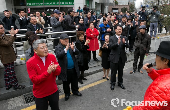 (서울=포커스뉴스) 김무성 새누리당 대표가 당 공천관리위원회의 결정에 반발해 유승민 의원 등 지역구 6곳에 대해 무공천을 선언해 갈등이 이어지고 있는 25일 오후 서울 여의도 당사 앞에서 김 대표의 지지자들이 집회를 하고 있다.