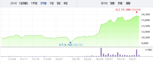 앞서 심정운 심엔터 대표는 15일 화이브라더스의 자회사 화이엔조이엔터테인먼트 외 4인과 최대주주 변경을 수반하는 주식양수도 계약을 체결했다고 공시했다. 총 양수도 금액은 120억원이다. 심엔터는 김윤석, 주원, 유해진 등이 소속된 연예기획사다.NEW 주가흐름<사진출처=네이버 캡쳐>