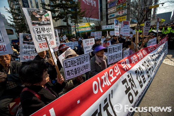 (서울=포커스뉴스) 새누리당이 최고위원회의를 열어 의결이 보류된 5개 지역구에 대한 추인 문제를 논의하고 있는 25일 오후 서울 영등포구 새누리당사 앞에서 어버이연합 관계자들이 '옥새투쟁'을 이어가고 있는 김무성 새누리당 대표의 행동을 규탄 하고 있다.