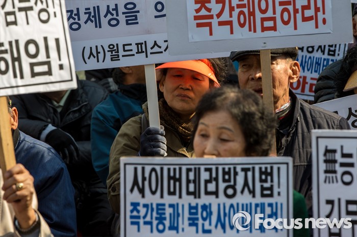 (서울=포커스뉴스) 새누리당이 최고위원회의를 열어 의결이 보류된 5개 지역구에 대한 추인 문제를 논의하고 있는 25일 오후 서울 영등포구 새누리당사 앞에서 어버이연합 관계자들이 '옥새투쟁'을 이어가고 있는 김무성 새누리당 대표의 행동을 규탄 하고 있다.