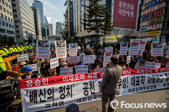 (서울=포커스뉴스) 새누리당이 최고위원회의를 열어 의결이 보류된 5개 지역구에 대한 추인 문제를 논의하고 있는 25일 오후 서울 영등포구 새누리당사 앞에서 어버이연합 관계자들이 '옥새투쟁'을 이어가고 있는 김무성 새누리당 대표의 행동을 규탄 하고 있다.
