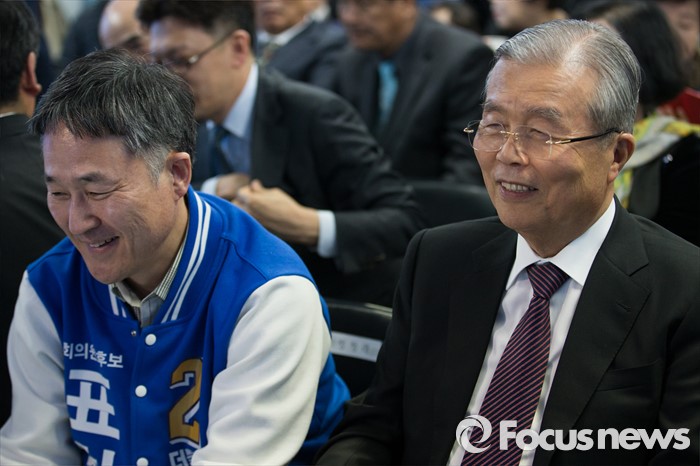 (용인=포커스뉴스) 김종인(오른쪽) 더불어민주당 비대위 대표가 25일 오후 경기도 용인시 표창원 후보 선거사무소 개소식에 참석해 표 후보와 환하게 웃고 있다.