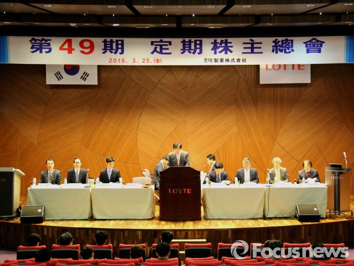 롯데제과는 25일 양평동 본사 7층 대강당에서 발행주식수(142만1400주)의 65.7%의 주주가 출석(위임포함)한 가운데 제49기 주주총회를 개최했다.