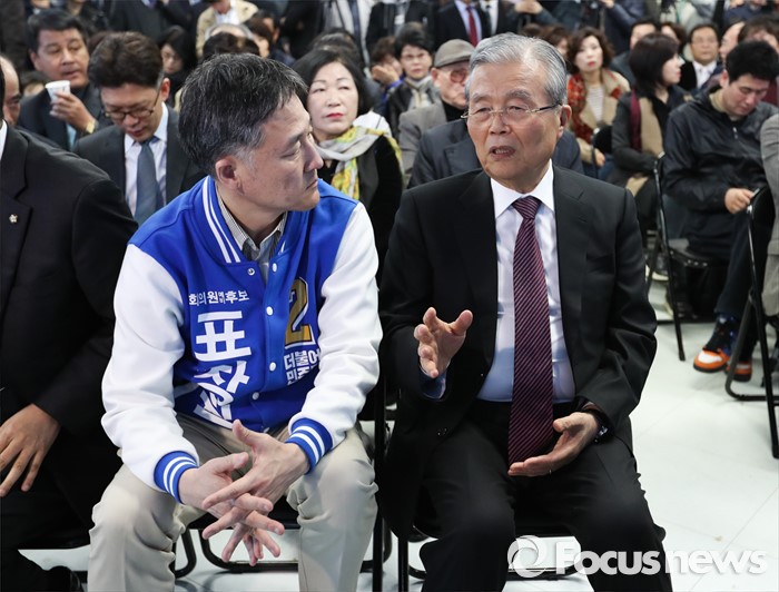 (용인=포커스뉴스) 김종인(오른쪽) 더불어민주당 비대위 대표가 25일 오후 경기도 용인시 표창원 후보 선거사무소 개소식에 참석해 표 후보와 대화하고 있다.