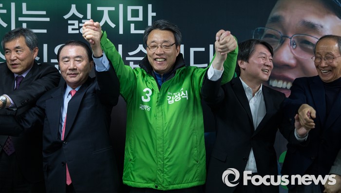 (서울=포커스뉴스) 안철수 국민의당 상임공동대표와 김성식 관악(갑) 예비후보가 25일 오후 서울 관악구 김 후보 선거사무소 개소식에서 내·외빈들과 함께 파이팅을 외치고 있다. 오른쪽부터 윤여준 전 환경부 장관, 안 대표, 이훈평 전 의원, 이상돈 공동선대위원장.