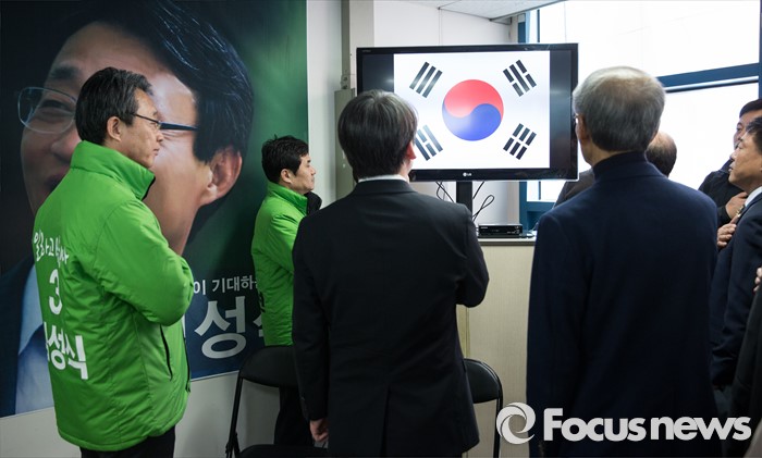 (서울=포커스뉴스) 안철수 국민의당 상임공동대표(가운데)가 25일 오후 서울 관악구 김성식 후보 선거사무소 개소식에서 윤여준 전 환경부장관과 국기에 대한 경례를 하고 있다. 왼쪽부터 김성식 후보, 안 대표, 윤 전 장관