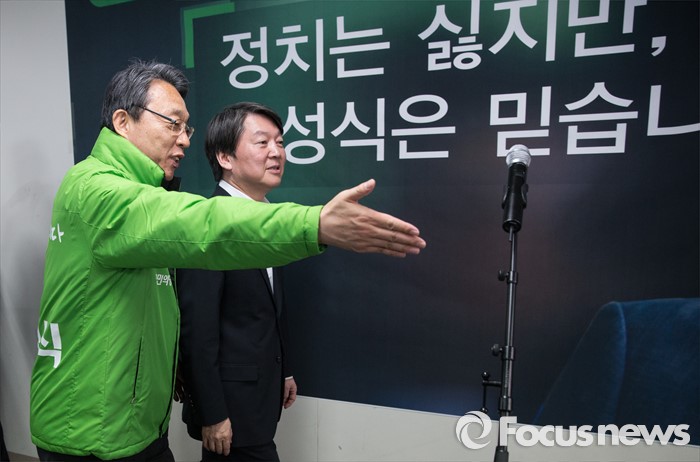 (서울=포커스뉴스) 국민의당 김성식 관악갑 후보(왼쪽)가 25일 오후 서울 관악구 김 후보 선거사무소 개소식에서 안철수 상임공동대표를 안내하고 있다.