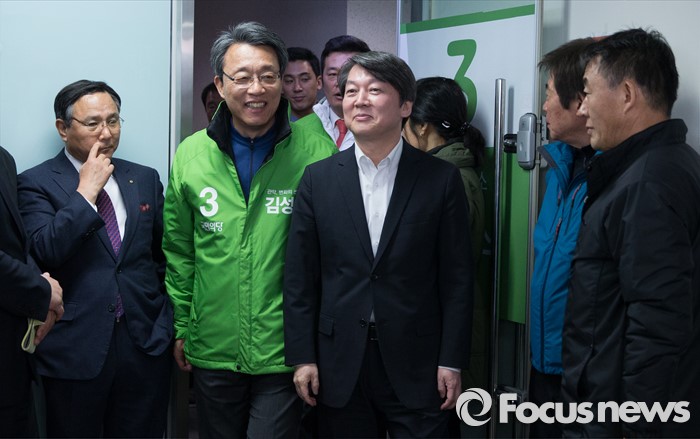 (서울=포커스뉴스) 국민의당 김성식 관악갑 후보(왼쪽 두번째)가 25일 오후 서울 관악구 김 후보 선거사무소 개소식에서 안철수 상임공동대표를 안내하고 있다.