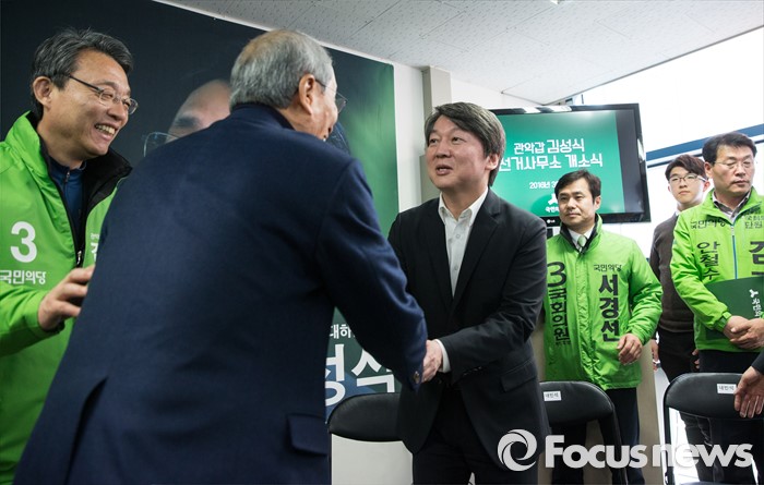 (서울=포커스뉴스) 안철수 국민의당 상임공동대표(가운데)가 25일 오후 서울 관악구 김성식 관악(갑) 예비후보 선거사무소 개소식에서 윤여준 전 환경부장관과 인사를 나누고 있다. 왼쪽부터 김성식 후보, 윤 전 장관, 안 대표