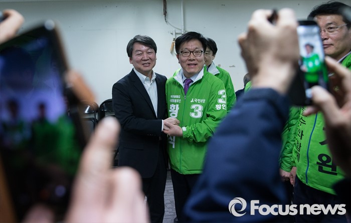 (서울=포커스뉴스) 안철수 국민의당 상임공동대표(왼쪽)가 25일 오후 서울 관악구 김성식 관악(갑) 예비후보 선거사무소 개소식에 참석해 황인직 원미(갑)예비후보와 기념사진을 찍고 있다.