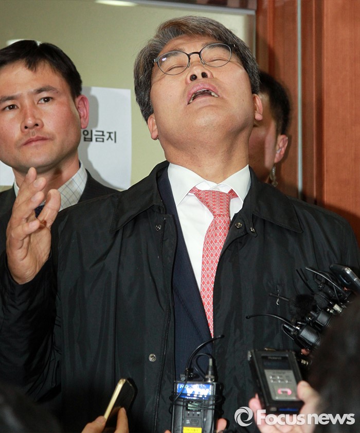 (서울=포커스뉴스) 이재만 새누리당 대구 동을 예비후보가 25일 오후 서울 여의도 당사 회의장 입구에서 최고위원회의 무공천 결정에 대해 자신의 입장을 취재진에게 전하고 있다. 이날 새누리당 최고위는 정종섭(대구 동갑), 추경호(대구 달성), 이인선(대구 수성을) 후보의 공천을 확정했으며, 유영하(서울 송파을), 이재만(대구 동을), 유재길(서울 은평을) 후보는 공천 의결 보류를 확정했다.