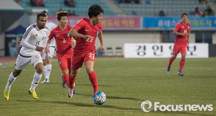 (이천=포커스뉴스) 25일 오후 경기 이천종합운동장에서 열린 KEB하나은행 초청 올림픽대표 대한민국과 알제리의 친선경기에서 전반전 한국 권창훈이 드리블을 하고 있다.
