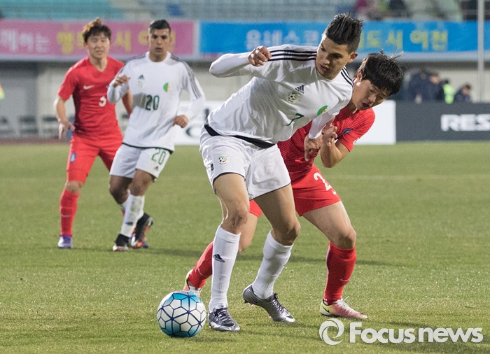 (이천=포커스뉴스) 25일 오후 경기 이천종합운동장에서 열린 KEB하나은행 초청 올림픽대표 대한민국과 알제리의 친선경기에서 전반전 한국 권창훈이 상대 선수와 볼다툼을 하고 있다.