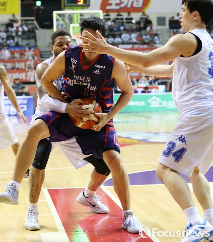 (고양=포커스뉴스) 25일 고양체육관에서 열린 2015-2016 프로농구 챔피언결정전 4차전 오리온-KCC경기에서 KCC 에밋이 오리온 김동욱의 볼을 뺏으려 잡고 있다. 점프볼이 선언됐다.