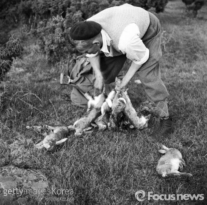 토끼는 1830년대에 정착민들이 들여왔다. 그러나 개체 수 조절에 실패하면서 뉴질랜드 농민들에게는 애물단지로 전락하고 말았다.사냥꾼이 붙잡은 토끼를 엮고 있다. 뉴질랜드에서는 부활절을 앞두고 성금요일 오전 9시부터 하루동안 개체 수 조절을 위해 토끼 사냥을 한다. (Photo by V. von Bonin/BIPs/Getty Images)2016.03.26 ⓒ게티이미지/이매진스