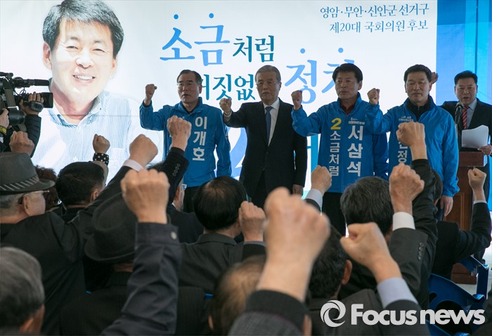 (무안=포커스뉴스) 26일 오후 전남 무안군에서 열린 서삼석 더불어민주당 전남 영암·무안·신안군 후보 선거사무소 개소식에 참석한 김종인 비대위 대표와 내빈들이 구호를 외치고 있다. 왼쪽부터 이개호 의원, 김 대표, 서 후보, 신정훈 의원.