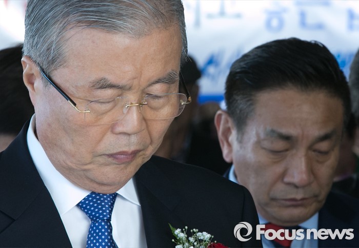 (무안=포커스뉴스) 26일 오후 전남 무안군에서 열린 서삼석 더불어민주당 전남 영암·무안·신안군 후보 선거사무소 개소식에 참석한 김종인(왼쪽) 비대위 대표가 묵념을 하고 있다.