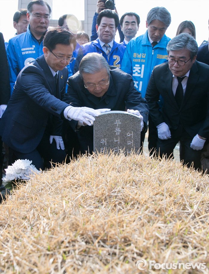 (광주=포커스뉴스) 김종인 더불어민주당 비대위 대표가 20대 총선 전남 및 광주지역 후보들과 함께 27일 오전 광주 북구 국립5·18민주묘지를 방문해 전영진 열사의 묘비를 만지고 있다.