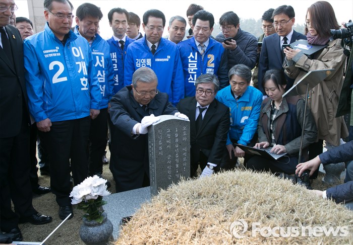 (광주=포커스뉴스) 김종인 더불어민주당 비대위 대표가 20대 총선 전남 및 광주지역 후보들과 함께 27일 오전 광주 북구 국립5·18민주묘지를 방문해 장방환 열사의 묘역 참배를 하고 있다.