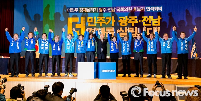 (광주=포커스뉴스) 김종인 더불어민주당 비대위 대표가 27일 오전 광주 서구 김대중컨벤션센터에서 열린 더불어민주당 경제살리기 광주·전남 20대 총선 후보자 연석회의에 참석해 후보자들과 함께 손을 들어 포즈를 취하고 있다.