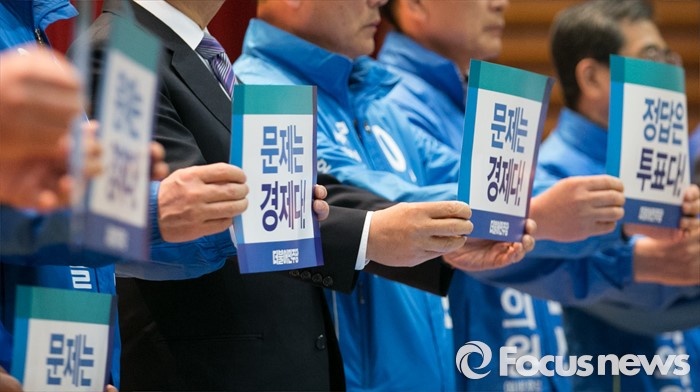 (광주=포커스뉴스) 김종인 더불어민주당 비대위 대표가 27일 오전 광주 서구 김대중컨벤션센터에서 열린 더불어민주당 경제살리기 광주·전남 20대 총선 후보자 연석회의에 참석해 후보자들과 피켓을 들고 퍼포먼스를 하고 있다.
